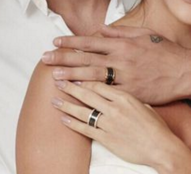 A cantora Preta Gil e seu marido Rodrigo Godoy também optaram por deixar o par de alianças super personalizado: colocaramo nas laterais do aro o apelido carinhoso do casal e inseriram diamantes incolores na unidade feminina e diamantes negros na unidade masculina da aliança.