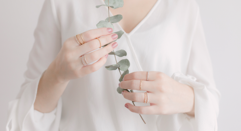 1 – Anel de noivado junto da aliança de casamento: esse é o costume mais comum e ambas as joias são usadas juntas no dedo anelar da mão esquerda.