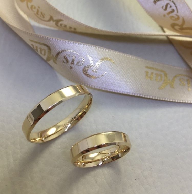Acima, o par de alianças Guarulhos em ouro rosé.